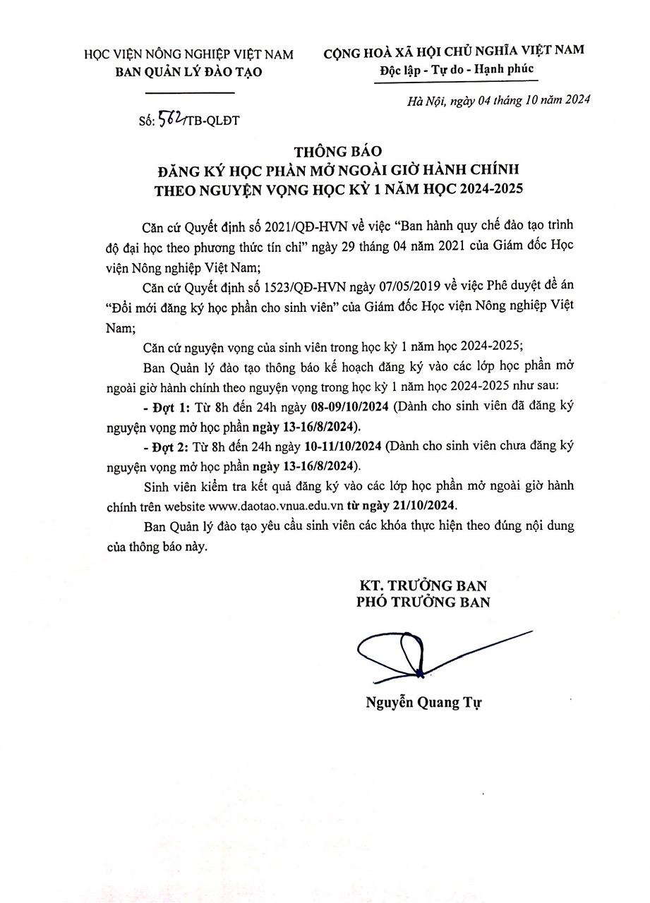 Đào tạo, Thông báo, Tin sinh viên Thông báo đăng ký học phần mở ngoài giờ hành chính theo nguyện vọng học kỳ 1 năm học 2024-2025 Ngày đăng: 04/10/202404/10/2024 by btvcodien Tin cùng thể loại Thông báo tuyển dụng Khảo sát tình hình việc làm của sinh viên tốt nghiệp năm 2024 Thông báo tổ chức Lễ bế giảng và trao bằng tốt nghiệp, bậc đào tạo Đại học, Hệ đào tạo chính quy đợt 3 năm 2025 Thông báo v/v mở lớp đặc biệt Học kỳ 1 năm học 2025-2026 Điều kiện để trở thành nghiên cứu sinh ngành Kỹ thuật cơ khí của khoa Cơ – Điện,Học viện Nông nghiệp Việt Nam