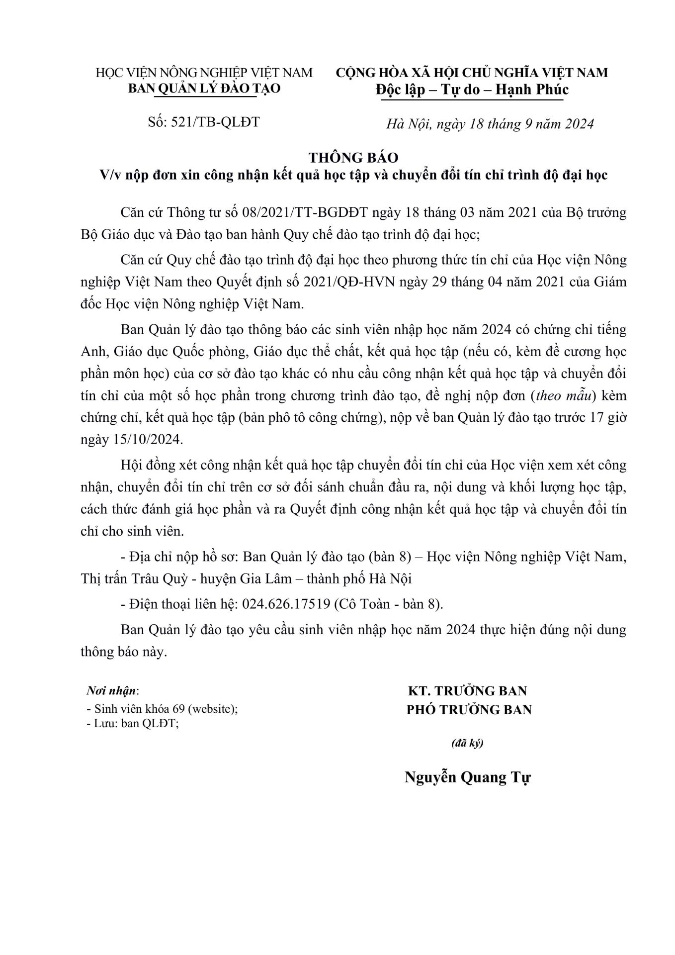 Đào tạo, Thông báo, Tin sinh viên Thông báo v/v nộp đơn xin công nhận kết quả học tập và chuyển đổi tín chỉ trình độ đại học Ngày đăng: 25/09/202425/09/2024 by btvcodien Đơn quy đổi các học phần tiếng anh Đơn công nhận học phần tương đương Tin cùng thể loại Thông báo tuyển dụng Khảo sát tình hình việc làm của sinh viên tốt nghiệp năm 2024 Thông báo tổ chức Lễ bế giảng và trao bằng tốt nghiệp, bậc đào tạo Đại học, Hệ đào tạo chính quy đợt 3 năm 2025 Thông báo v/v mở lớp đặc biệt Học kỳ 1 năm học 2025-2026 Điều kiện để trở thành nghiên cứu sinh ngành Kỹ thuật cơ khí của khoa Cơ – Điện,Học viện Nông nghiệp Việt Nam