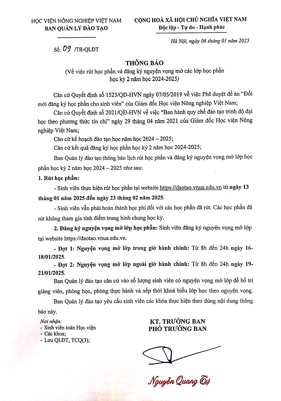 Đào tạo, Thông báo, Tin sinh viên Thông báo v/v rút học phần và đăng ký nguyện vọng mở các lớp học phần học kỳ 2 năm học 2024-2025 Ngày đăng: 16/01/202516/01/2025 by btvcodien Tin cùng thể loại Thông báo tuyển dụng Khảo sát tình hình việc làm của sinh viên tốt nghiệp năm 2024 Thông báo tổ chức Lễ bế giảng và trao bằng tốt nghiệp, bậc đào tạo Đại học, Hệ đào tạo chính quy đợt 3 năm 2025 Thông báo v/v mở lớp đặc biệt Học kỳ 1 năm học 2025-2026 Điều kiện để trở thành nghiên cứu sinh ngành Kỹ thuật cơ khí của khoa Cơ – Điện,Học viện Nông nghiệp Việt Nam