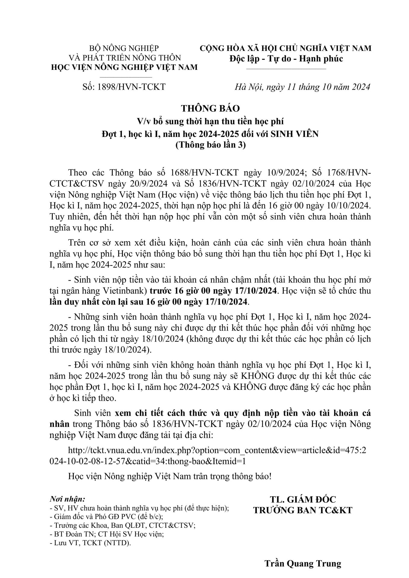 Thông báo, Tin sinh viên Thông báo bổ sung thời hạn thu tiền học phí Đợt 1, học kỳ I, năm học 2024-2025 đối với SINH VIÊN (thông báo lần 3) Ngày đăng: 16/10/202416/10/2024 by btvcodien Tin cùng thể loại Thông báo tuyển dụng Khảo sát tình hình việc làm của sinh viên tốt nghiệp năm 2024 Thông báo tổ chức Lễ bế giảng và trao bằng tốt nghiệp, bậc đào tạo Đại học, Hệ đào tạo chính quy đợt 3 năm 2025 Thông báo v/v mở lớp đặc biệt Học kỳ 1 năm học 2025-2026 Điều kiện để trở thành nghiên cứu sinh ngành Kỹ thuật cơ khí của khoa Cơ – Điện,Học viện Nông nghiệp Việt Nam