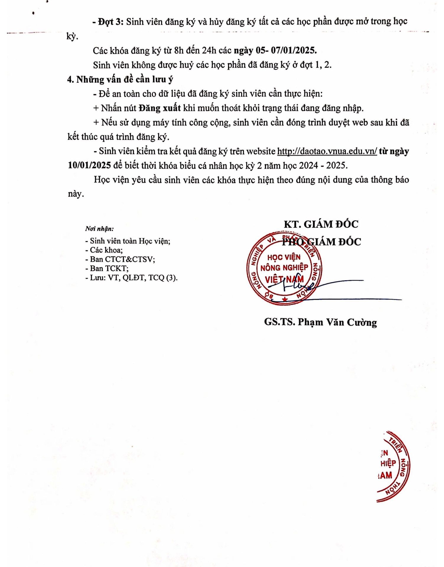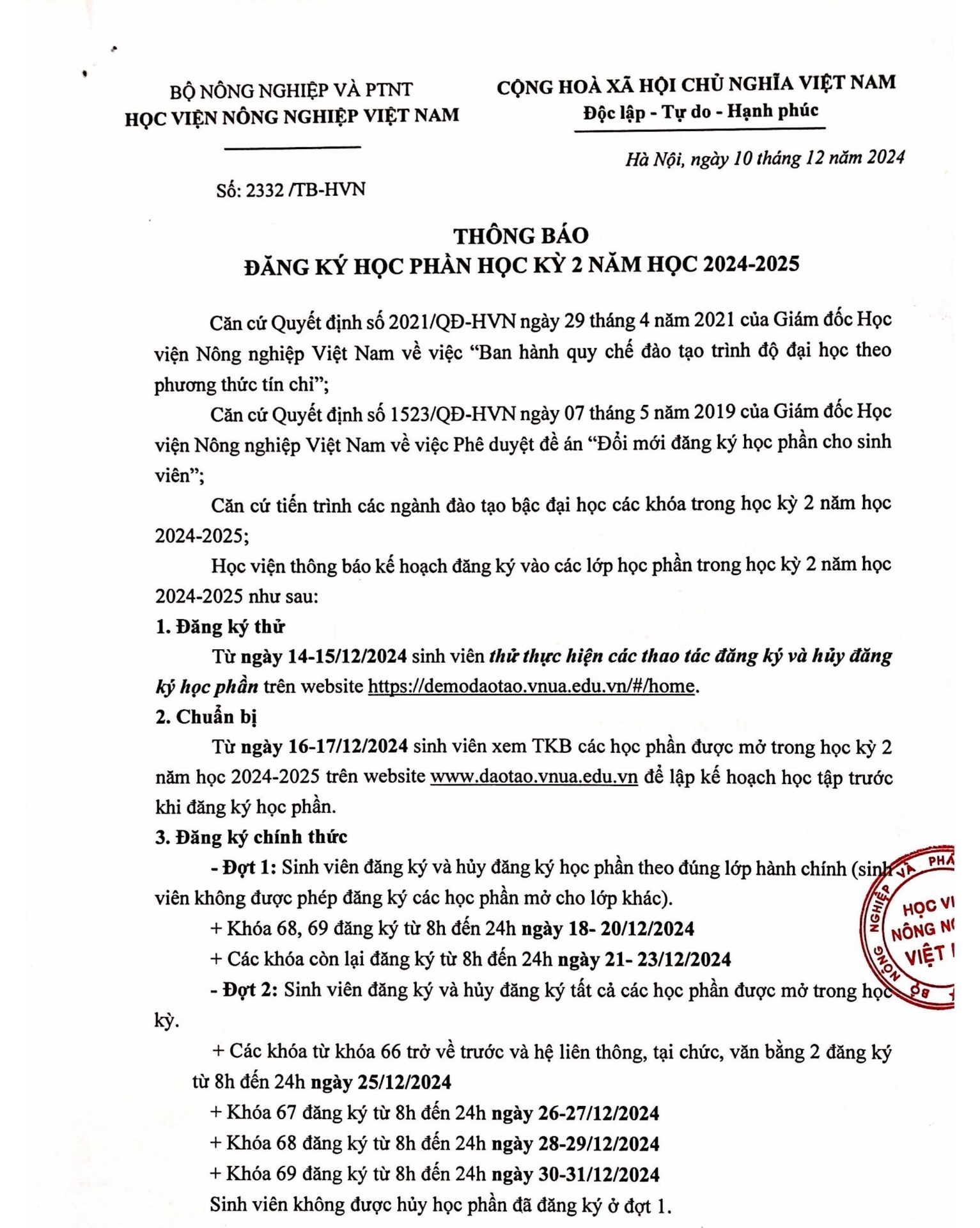 Thông báo, Tin sinh viên Thông báo đăng ký học phần học kỳ 2 năm học 2024-2025 Ngày đăng: 13/12/202413/12/2024 by btvcodien Đăng ký thử tại: https://demodaotao.vnua.edu.vn/#/home Tin cùng thể loại Thông báo tuyển dụng Khảo sát tình hình việc làm của sinh viên tốt nghiệp năm 2024 Thông báo tổ chức Lễ bế giảng và trao bằng tốt nghiệp, bậc đào tạo Đại học, Hệ đào tạo chính quy đợt 3 năm 2025 Thông báo v/v mở lớp đặc biệt Học kỳ 1 năm học 2025-2026 Điều kiện để trở thành nghiên cứu sinh ngành Kỹ thuật cơ khí của khoa Cơ – Điện,Học viện Nông nghiệp Việt Nam