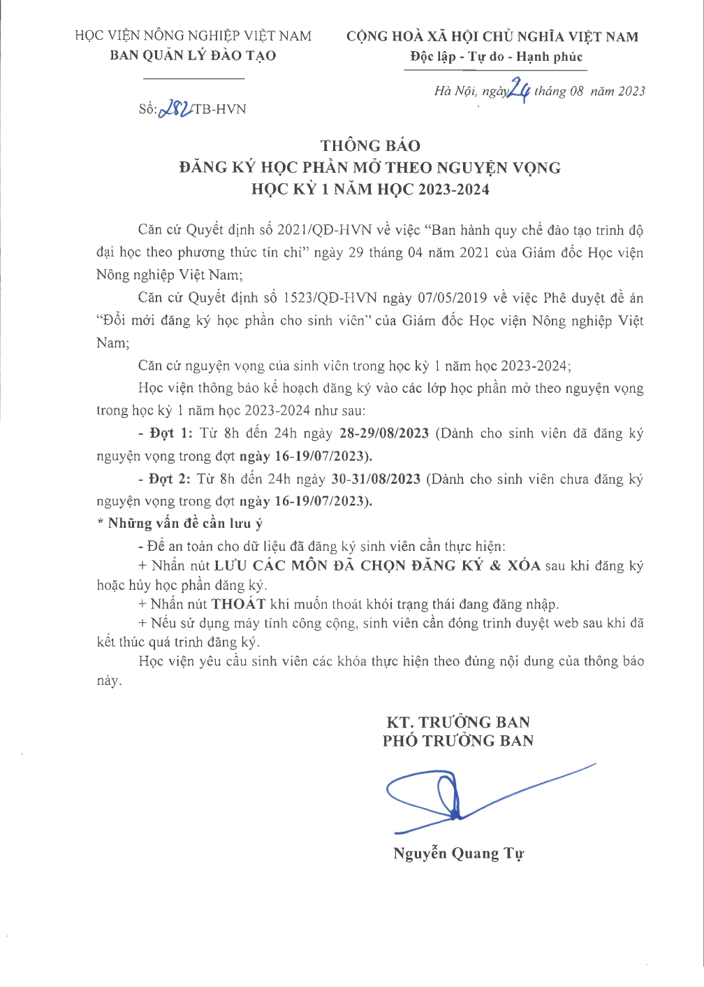 Thông báo, Tin sinh viên Thông báo đăng ký học phần mở theo nguyện vọng học kỳ 1 năm học 2023-2024 Ngày đăng: 26/08/202326/08/2023 by btvcodien Tin cùng thể loại Thông báo tuyển dụng Khảo sát tình hình việc làm của sinh viên tốt nghiệp năm 2024 Thông báo tổ chức Lễ bế giảng và trao bằng tốt nghiệp, bậc đào tạo Đại học, Hệ đào tạo chính quy đợt 3 năm 2025 Thông báo v/v mở lớp đặc biệt Học kỳ 1 năm học 2025-2026 Điều kiện để trở thành nghiên cứu sinh ngành Kỹ thuật cơ khí của khoa Cơ – Điện,Học viện Nông nghiệp Việt Nam