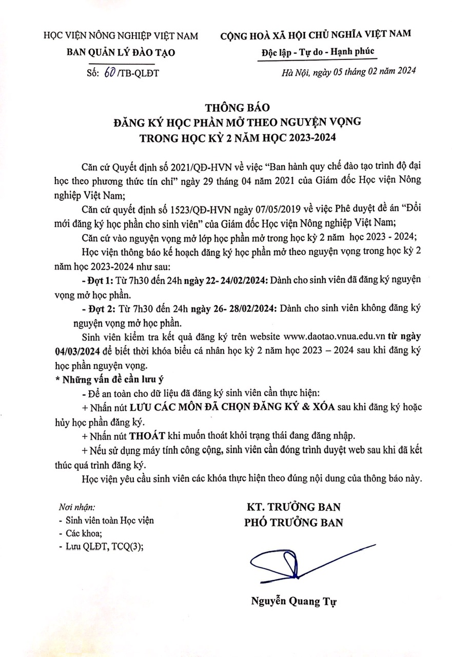 Thông báo, Tin sinh viên Thông báo đăng ký học phần mở theo nguyện vọng học kỳ 2 năm học 2023 – 2024 Ngày đăng: 05/02/2024 by btvcodien Tin cùng thể loại Thông báo tuyển dụng Khảo sát tình hình việc làm của sinh viên tốt nghiệp năm 2024 Thông báo tổ chức Lễ bế giảng và trao bằng tốt nghiệp, bậc đào tạo Đại học, Hệ đào tạo chính quy đợt 3 năm 2025 Thông báo v/v mở lớp đặc biệt Học kỳ 1 năm học 2025-2026 Điều kiện để trở thành nghiên cứu sinh ngành Kỹ thuật cơ khí của khoa Cơ – Điện,Học viện Nông nghiệp Việt Nam