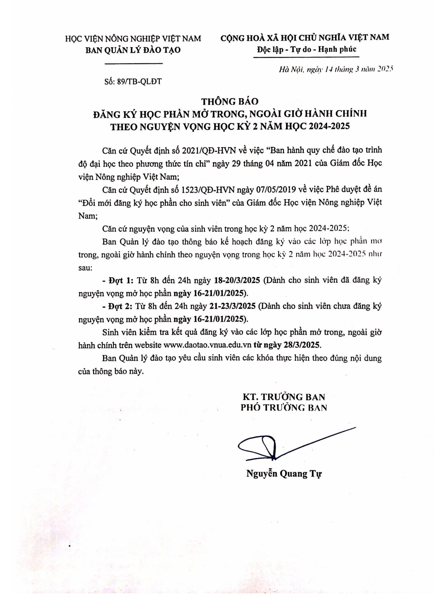 Thông báo, Tin sinh viên THÔNG BÁO ĐĂNG KÝ HỌC PHẦN MỞ TRONG, NGOÀI GIỜ HÀNH CHÍNH THEO NGUYỆN VỌNG HỌC KỲ 2 NĂM HỌC 2024-2025 Ngày đăng: 15/03/202515/03/2025 by btvcodien Tin cùng thể loại Thông báo tuyển dụng Khảo sát tình hình việc làm của sinh viên tốt nghiệp năm 2024 Thông báo tổ chức Lễ bế giảng và trao bằng tốt nghiệp, bậc đào tạo Đại học, Hệ đào tạo chính quy đợt 3 năm 2025 Thông báo v/v mở lớp đặc biệt Học kỳ 1 năm học 2025-2026 Điều kiện để trở thành nghiên cứu sinh ngành Kỹ thuật cơ khí của khoa Cơ – Điện,Học viện Nông nghiệp Việt Nam
