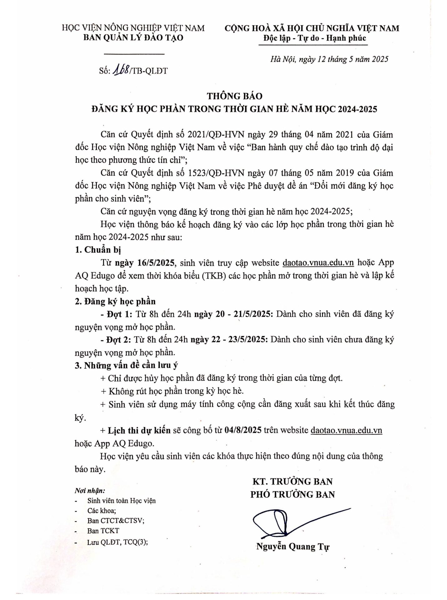 Thông báo, Tin sinh viên Thông báo đăng ký học phần trong thời gian hè năm học 2024-2025 Ngày đăng: 14/05/2025 by btvcodien Tin cùng thể loại Thông báo tuyển dụng Khảo sát tình hình việc làm của sinh viên tốt nghiệp năm 2024 Thông báo tổ chức Lễ bế giảng và trao bằng tốt nghiệp, bậc đào tạo Đại học, Hệ đào tạo chính quy đợt 3 năm 2025 Thông báo v/v mở lớp đặc biệt Học kỳ 1 năm học 2025-2026 Điều kiện để trở thành nghiên cứu sinh ngành Kỹ thuật cơ khí của khoa Cơ – Điện,Học viện Nông nghiệp Việt Nam