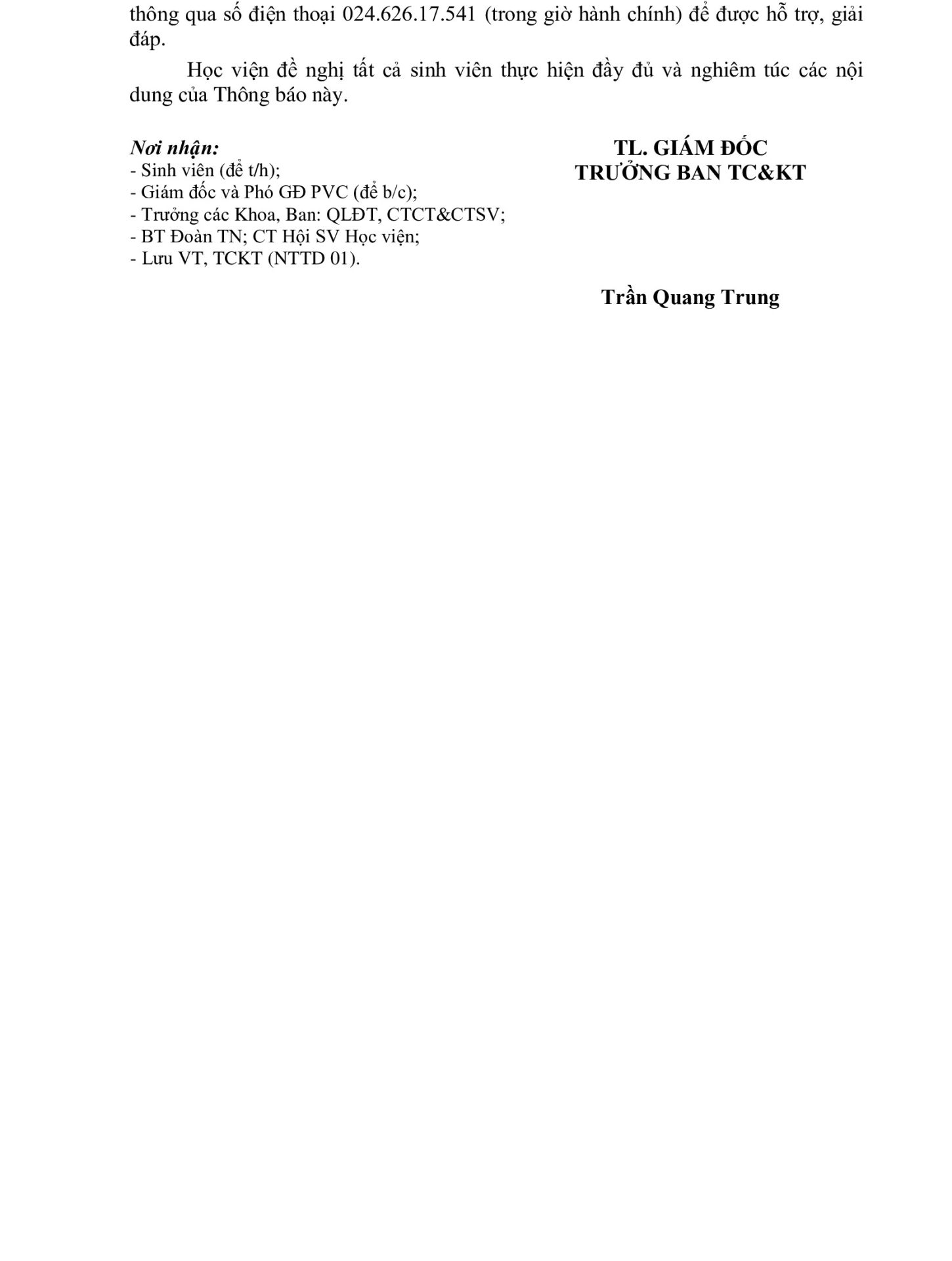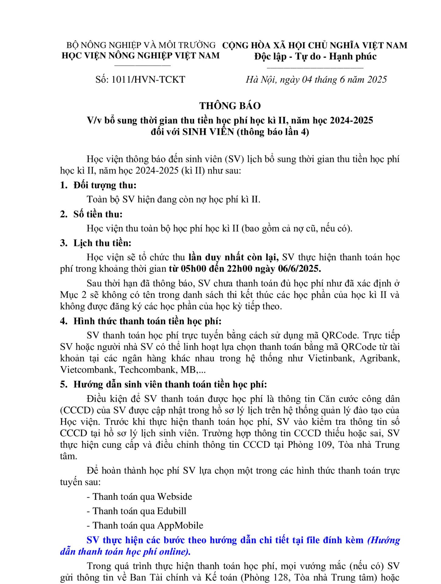 Thông báo, Tin sinh viên Thông báo v/v bổ sung thời gian thu tiền học phí học kì II, năm học 2024-2025 đối với SINH VIÊN (thông báo lần 4) Ngày đăng: 05/06/202505/06/2025 by btvcodien Hướng dẫn thanh toán học phí online Tin cùng thể loại Thông báo tuyển dụng Khảo sát tình hình việc làm của sinh viên tốt nghiệp năm 2024 Thông báo tổ chức Lễ bế giảng và trao bằng tốt nghiệp, bậc đào tạo Đại học, Hệ đào tạo chính quy đợt 3 năm 2025 Thông báo v/v mở lớp đặc biệt Học kỳ 1 năm học 2025-2026 Điều kiện để trở thành nghiên cứu sinh ngành Kỹ thuật cơ khí của khoa Cơ – Điện,Học viện Nông nghiệp Việt Nam
