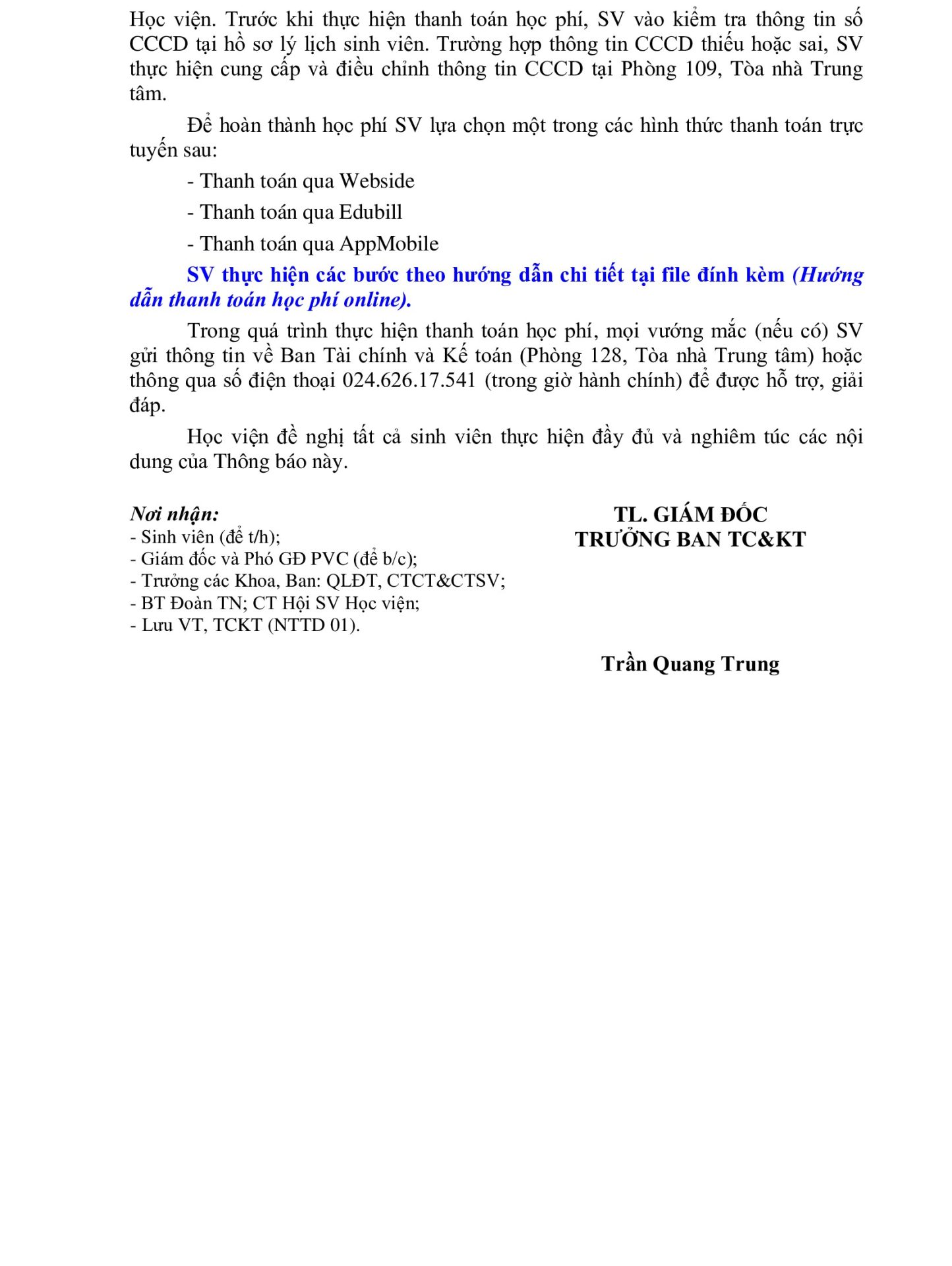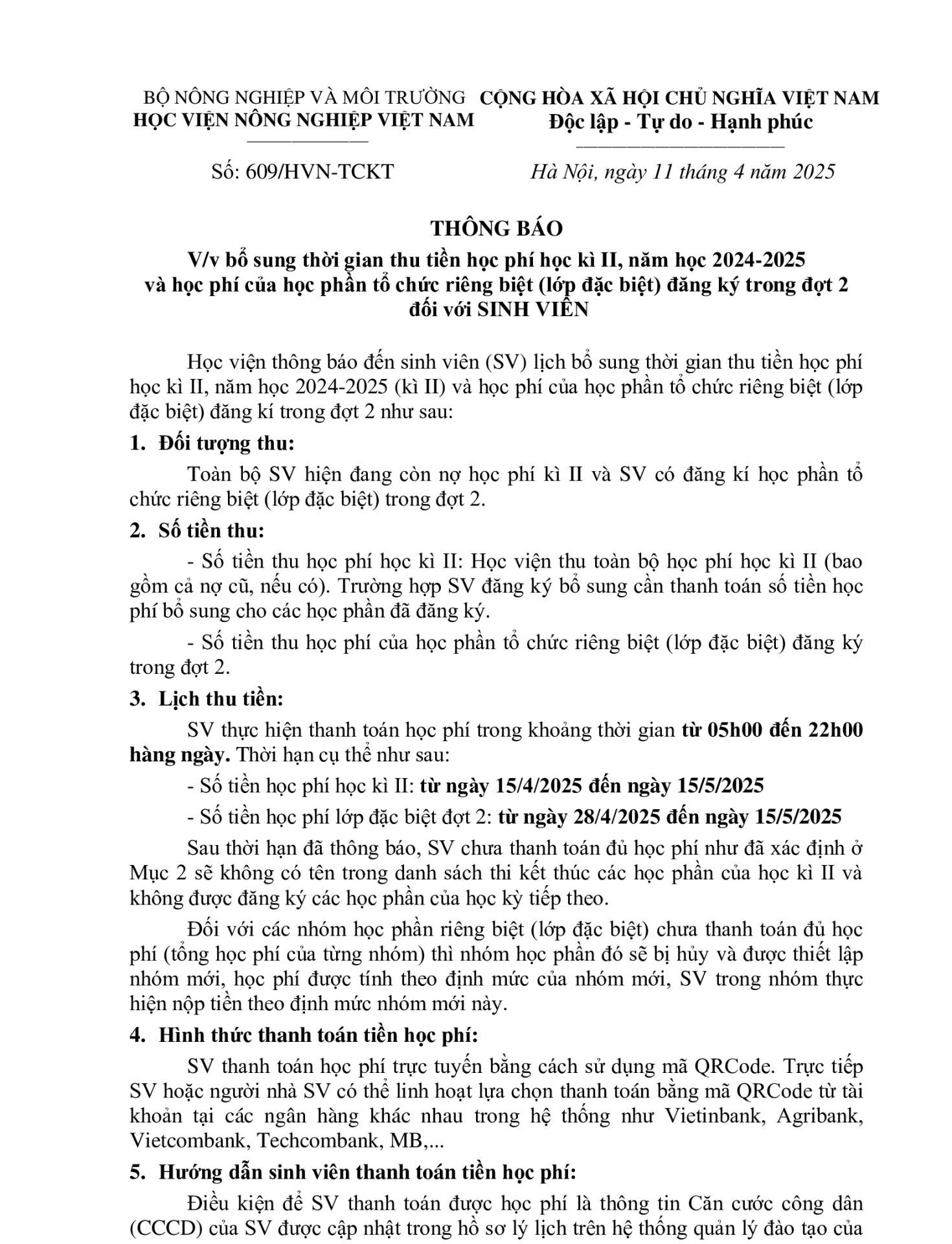 Thông báo v/v bổ sung thời gian thu tiền học phí học kì II, năm học 2024-2025 và học phí của học phần tổ chức riêng biệt (lớp đặc biệt) đăng ký trong đợt 2 đối với SINH VIÊN