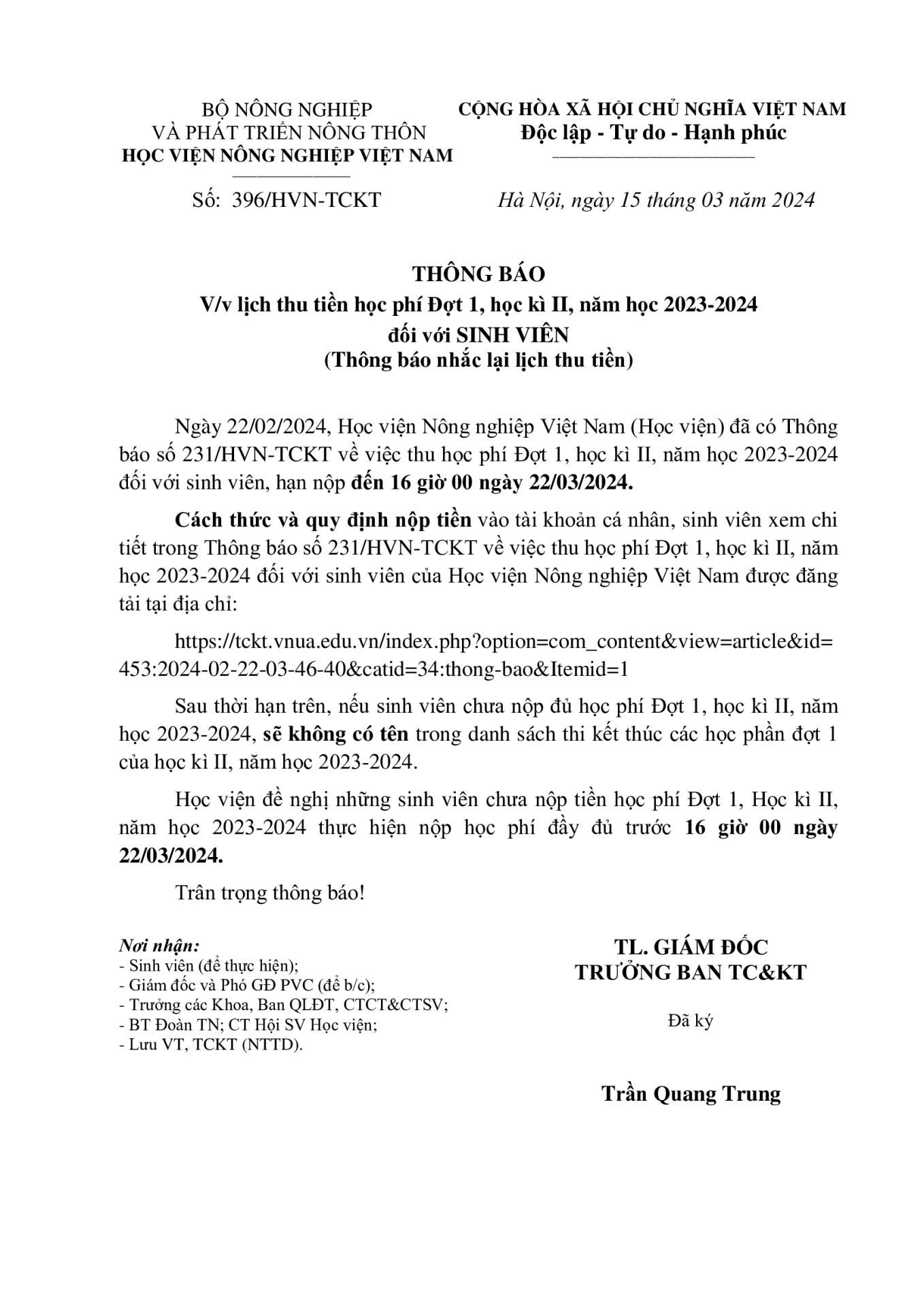 Thông báo, Tin sinh viên Thông báo V/v bổ sung thời gian thu tiền học phí học kỳ hè, năm học 2023-2024 đối với SINH VIÊN (Thông báo lần 2) Ngày đăng: 31/07/202431/07/2024 by btvcodien Tin cùng thể loại Thông báo tuyển dụng Khảo sát tình hình việc làm của sinh viên tốt nghiệp năm 2024 Thông báo tổ chức Lễ bế giảng và trao bằng tốt nghiệp, bậc đào tạo Đại học, Hệ đào tạo chính quy đợt 3 năm 2025 Thông báo v/v mở lớp đặc biệt Học kỳ 1 năm học 2025-2026 Điều kiện để trở thành nghiên cứu sinh ngành Kỹ thuật cơ khí của khoa Cơ – Điện,Học viện Nông nghiệp Việt Nam