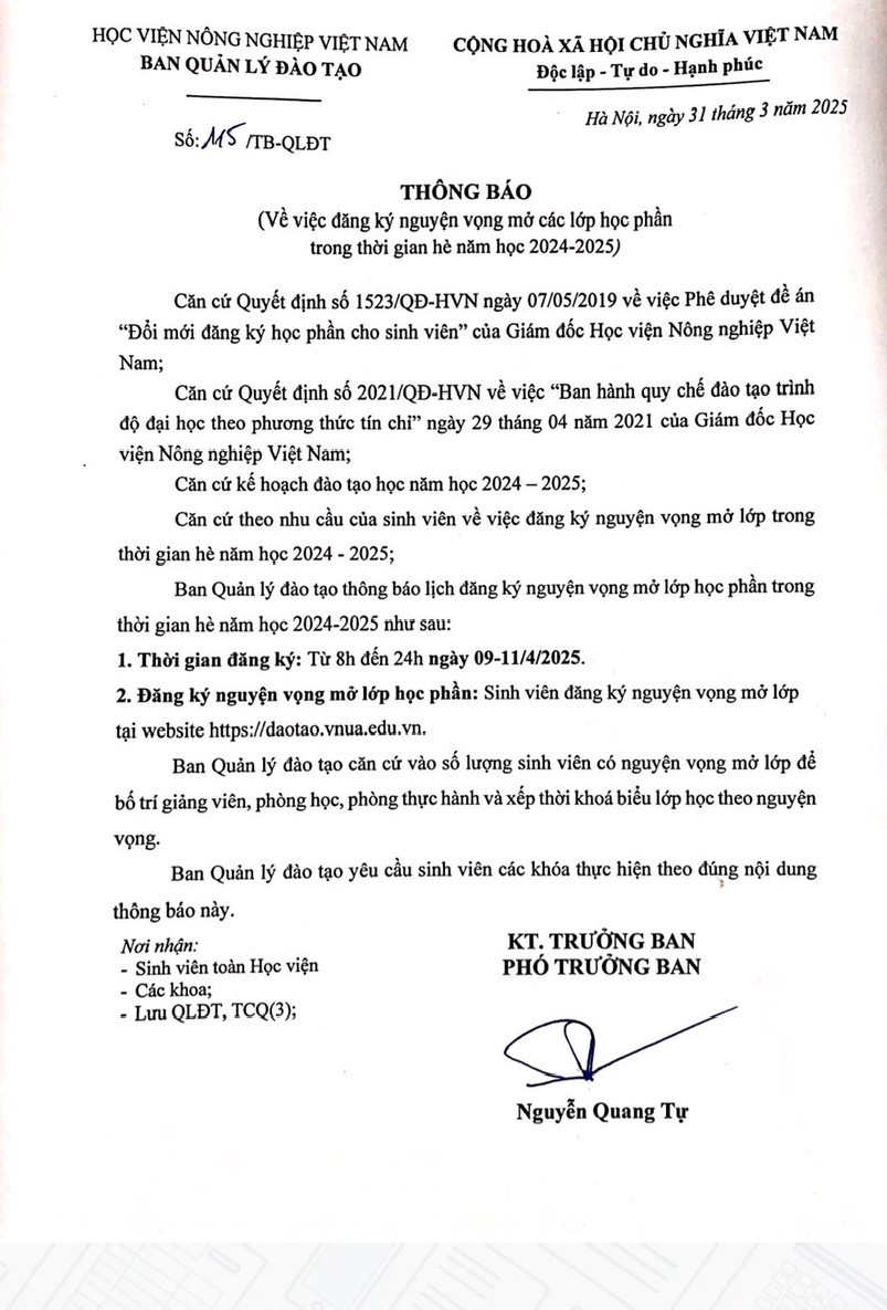 Thông báo, Tin sinh viên Thông báo V/v đăng ký nguyện vọng mở các lớp học phần trong thời gian hè năm học 2024-2025 Ngày đăng: 03/04/2025 by btvcodien Tin cùng thể loại Thông báo tuyển dụng Khảo sát tình hình việc làm của sinh viên tốt nghiệp năm 2024 Thông báo tổ chức Lễ bế giảng và trao bằng tốt nghiệp, bậc đào tạo Đại học, Hệ đào tạo chính quy đợt 3 năm 2025 Thông báo v/v mở lớp đặc biệt Học kỳ 1 năm học 2025-2026 Điều kiện để trở thành nghiên cứu sinh ngành Kỹ thuật cơ khí của khoa Cơ – Điện,Học viện Nông nghiệp Việt Nam