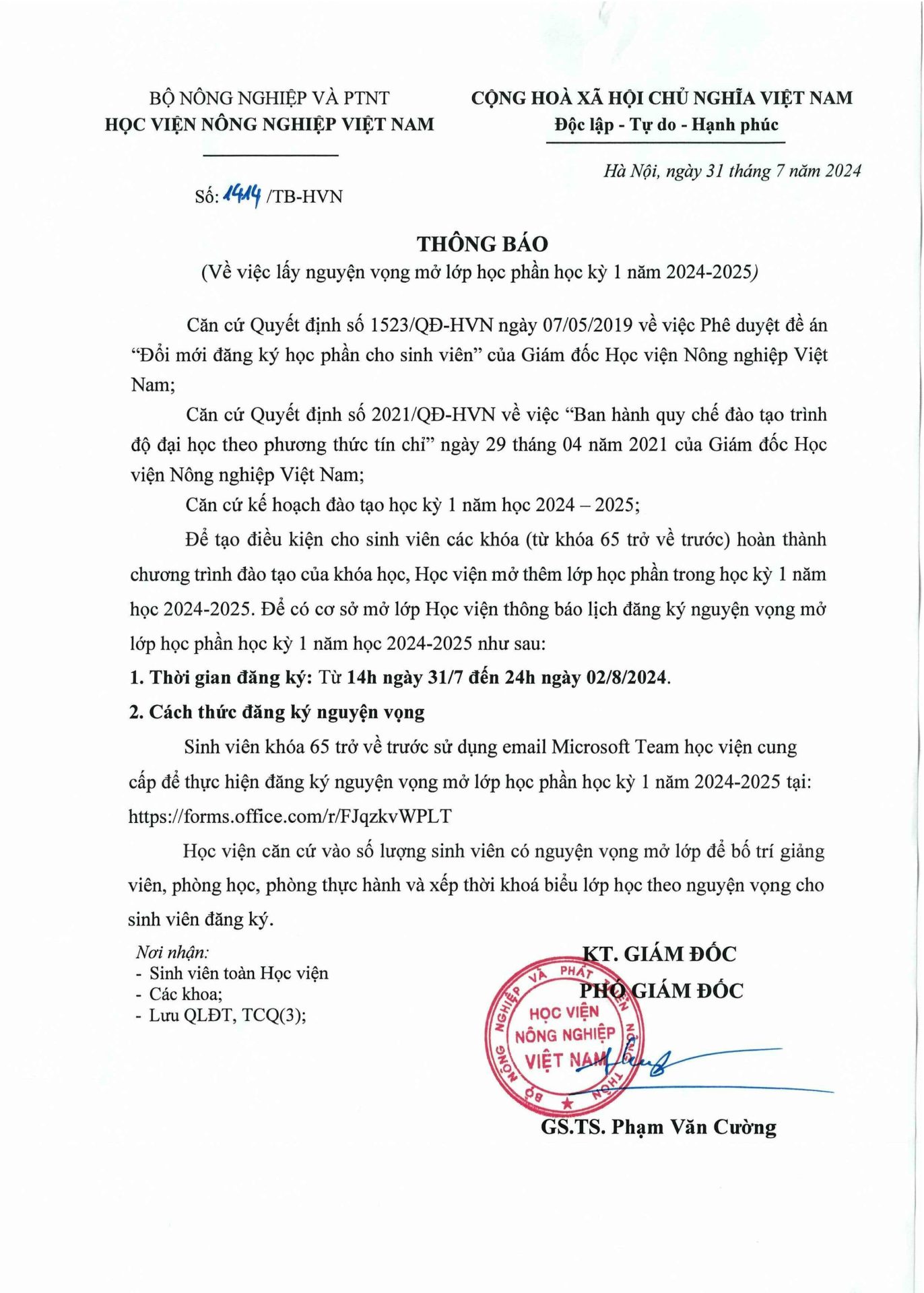 Thông báo, Tin sinh viên Thông báo V/v lấy nguyện vọng mở lớp học phần học kỳ 1 năm học 2024-2025 Ngày đăng: 31/07/202431/07/2024 by btvcodien Link đăng ký Nguyện vọng Tin cùng thể loại Thông báo tuyển dụng Khảo sát tình hình việc làm của sinh viên tốt nghiệp năm 2024 Thông báo tổ chức Lễ bế giảng và trao bằng tốt nghiệp, bậc đào tạo Đại học, Hệ đào tạo chính quy đợt 3 năm 2025 Thông báo v/v mở lớp đặc biệt Học kỳ 1 năm học 2025-2026 Điều kiện để trở thành nghiên cứu sinh ngành Kỹ thuật cơ khí của khoa Cơ – Điện,Học viện Nông nghiệp Việt Nam