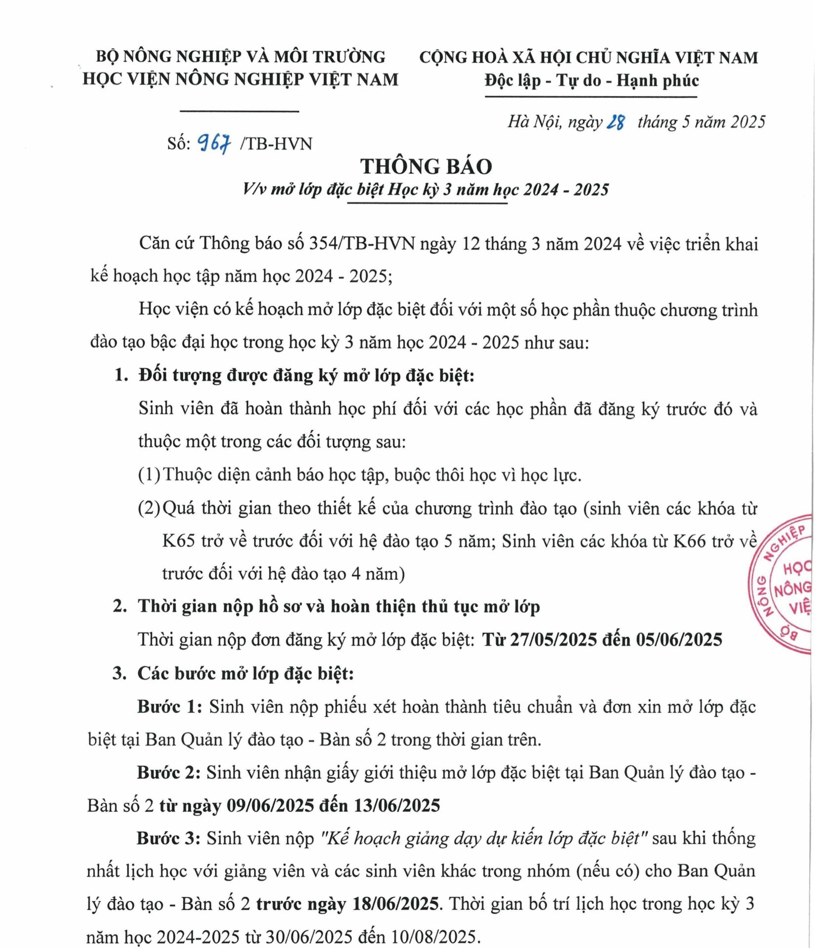 Thông báo, Tin sinh viên Thông báo V/v mở lớp đặc biệt Học kỳ 3 năm học 2024-2025 Ngày đăng: 30/05/2025 by btvcodien Tin cùng thể loại Thông báo tuyển dụng Khảo sát tình hình việc làm của sinh viên tốt nghiệp năm 2024 Thông báo tổ chức Lễ bế giảng và trao bằng tốt nghiệp, bậc đào tạo Đại học, Hệ đào tạo chính quy đợt 3 năm 2025 Thông báo v/v mở lớp đặc biệt Học kỳ 1 năm học 2025-2026 Điều kiện để trở thành nghiên cứu sinh ngành Kỹ thuật cơ khí của khoa Cơ – Điện,Học viện Nông nghiệp Việt Nam
