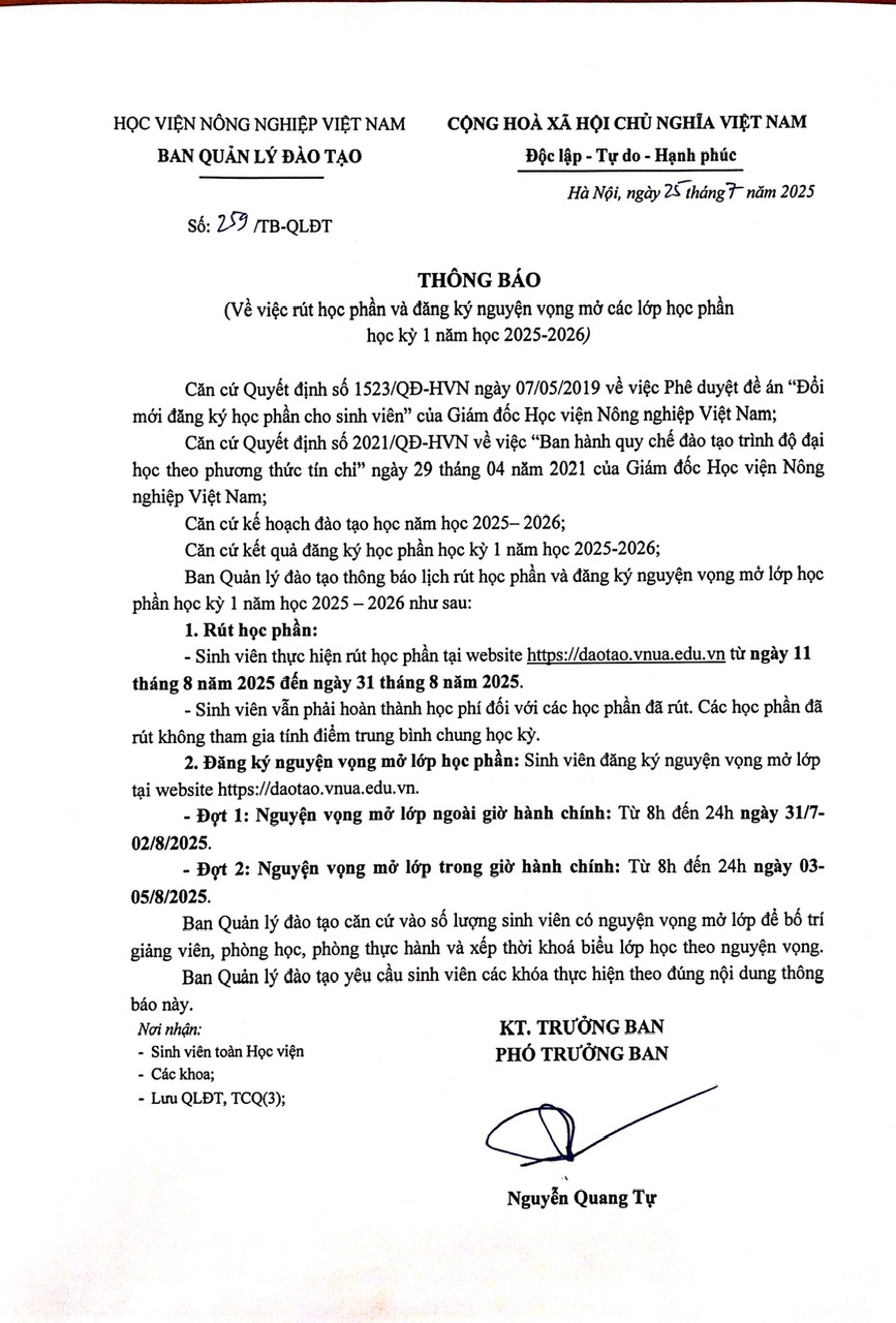 Thông báo v/v rút học phần và đăng ký nguyện vọng mở các lớp học phần học kỳ 1 năm học 2025-2026