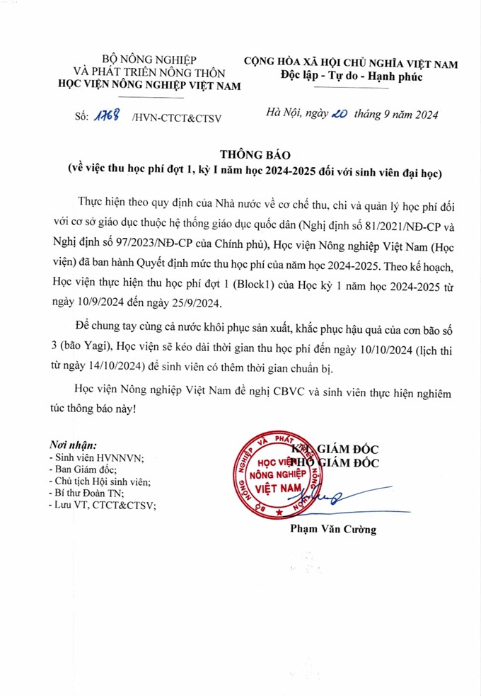 Thông báo, Tin sinh viên Thông báo về việc thu học phí đợt 1, kỳ I năm học 2024-2025 đối với sinh viên đại học Ngày đăng: 23/09/2024 by btvcodien Tin cùng thể loại Thông báo tuyển dụng Khảo sát tình hình việc làm của sinh viên tốt nghiệp năm 2024 Thông báo tổ chức Lễ bế giảng và trao bằng tốt nghiệp, bậc đào tạo Đại học, Hệ đào tạo chính quy đợt 3 năm 2025 Thông báo v/v mở lớp đặc biệt Học kỳ 1 năm học 2025-2026 Điều kiện để trở thành nghiên cứu sinh ngành Kỹ thuật cơ khí của khoa Cơ – Điện,Học viện Nông nghiệp Việt Nam