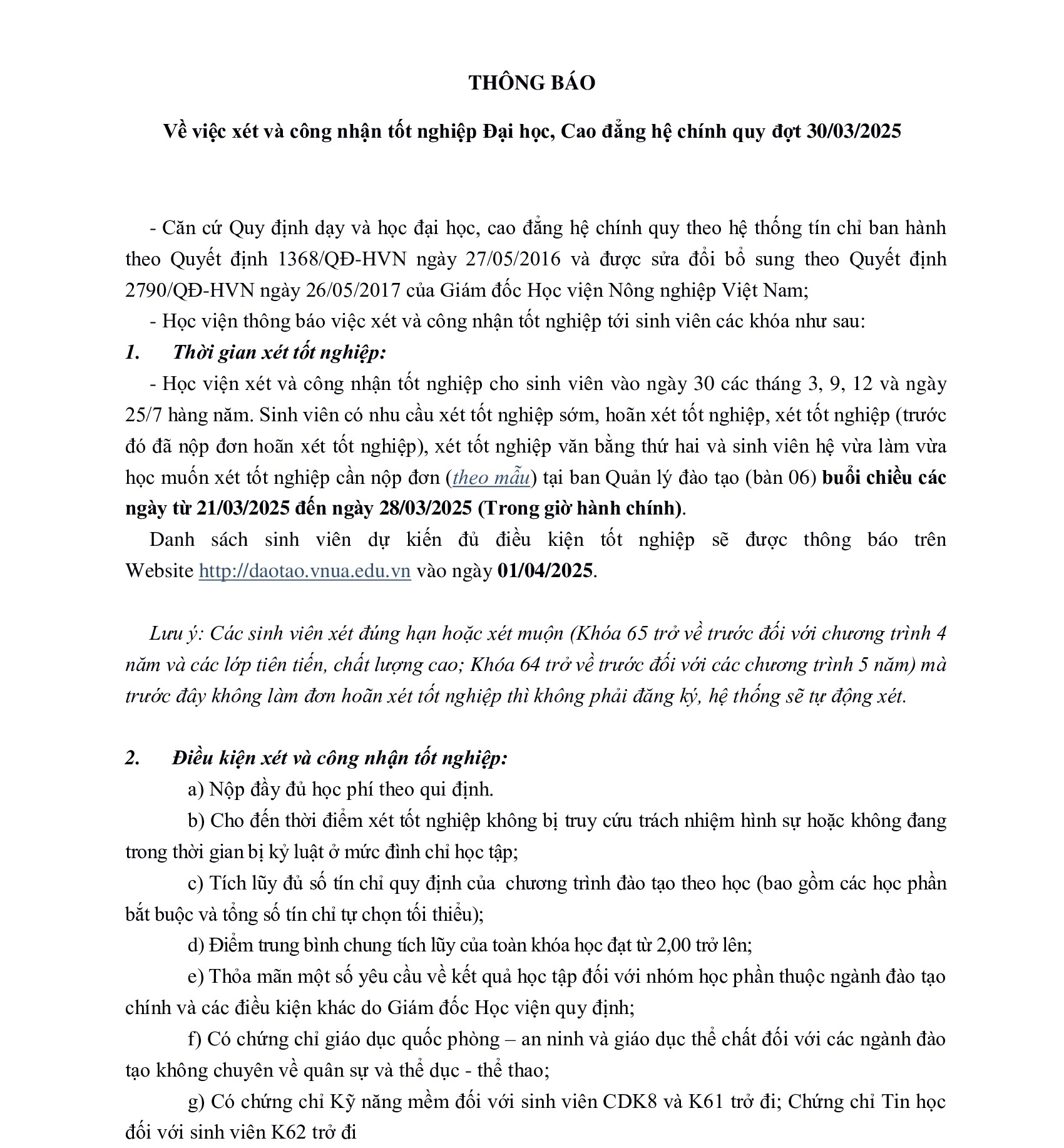 Thông báo, Tin sinh viên Thông báo về việc xét và công nhận tốt nghiệp Đại học, Cao đẳng hệ chính quy đợt 30/3/2025 Ngày đăng: 24/03/202524/03/2025 by btvcodien Tin cùng thể loại Thông báo tuyển dụng Khảo sát tình hình việc làm của sinh viên tốt nghiệp năm 2024 Thông báo tổ chức Lễ bế giảng và trao bằng tốt nghiệp, bậc đào tạo Đại học, Hệ đào tạo chính quy đợt 3 năm 2025 Thông báo v/v mở lớp đặc biệt Học kỳ 1 năm học 2025-2026 Điều kiện để trở thành nghiên cứu sinh ngành Kỹ thuật cơ khí của khoa Cơ – Điện,Học viện Nông nghiệp Việt Nam