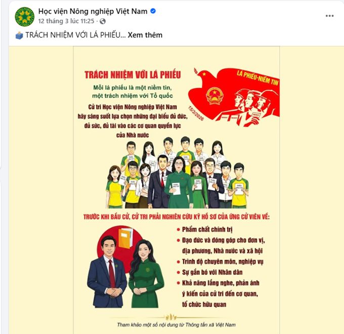 Trước ngày bầu cử, Học viện Nông nghiệp Việt Nam đã tích cực tuyên truyền, phổ biến các quy định về bầu cử, tổ chức các hoạt động giới thiệu tiểu sử ứng cử viên, hướng dẫn sinh viên tra cứu thông tin cử tri và thực hiện các bước bỏ phiếu. Nhờ đó, cán bộ, viên chức, sinh viên trong Học viện đã nắm rõ quy trình và tích cực tham gia ngày hội lớn của toàn dân.