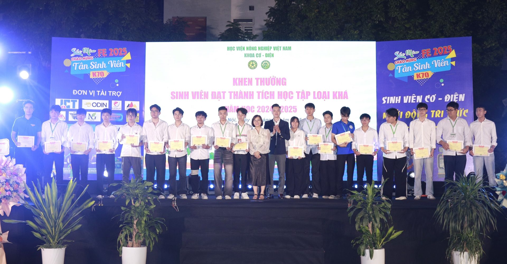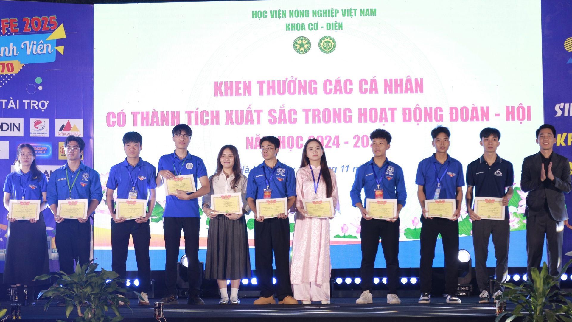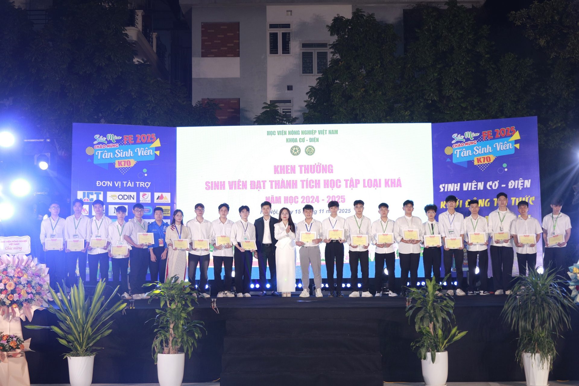 Lê tổng kết cũng là dịp để tuyên dương và khen thưởng những sinh viên có thành tích xuất sắc trong học tập, nghiên cứu khoa học và hoạt động phong trào. Các sinh viên được trao giấy khen và phần thưởng, ghi nhận sự cố gắng và nỗ lực trong suốt năm học 2024 – 2025 vừa qua gồm có: 02 tập thể lớp đạt danh hiệu tập thể xuất sắc, 02 sinh viên xuất sắc, 13 SV giỏi, 105 sinh viên khá (điểm TBNH hệ 10>7,0) và 01 sinh viên đạt giải Nhất kỳ thì Olympic toán học sinh viên toàn quốc lần thứ 31; 02 sinh viên và 01 nhóm sinh viên có thành tích tốt trong công tác NCKH; 22 cá nhân và 03 tập thể Đoàn – Hội đạt thành tích xuất sắc trong công tác Đoàn; CLB Rô bốt & Công nghệ đạt 01 giải Nhất và 01 giải Ba cuộc thi Khởi nghiệp nông nghiệp đổi mới sáng tạo 2024, đạt giải Ba cuộc thi APEC Innovation năm 2025…..