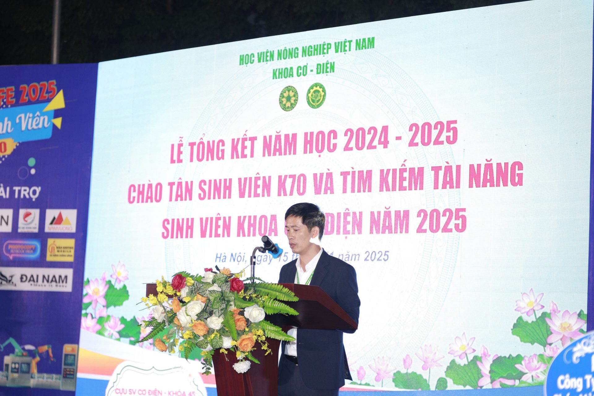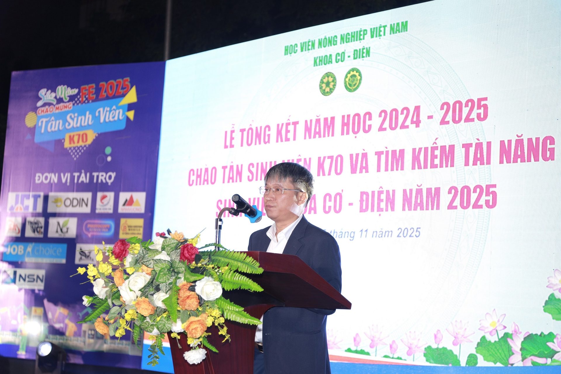 Phát biểu chỉ đạo tại Lễ tổng kết, PGS.TS. Vũ Ngọc Huyên – Phó Bí thư Thường trực Đảng ủy, Phó Chủ tịch Phụ trách Hội đồng Học viện, Phó Giám đốc Học viện gửi lời chúc mừng tới tập thể sinh viên khoa Cơ – Điện. Thầy khẳng định những thành tích đạt được là minh chứng cho quá trình học tập và rèn luyện không ngừng, đồng thời là hành trang để các em bước vào chặng đường mới. Thầy cũng tin tưởng khoa Cơ – Điện sẽ duy trì và tiếp tục phát huy các thế mạnh để năm học 2025-2026 Khoa sẽ thành công hơn nữa.