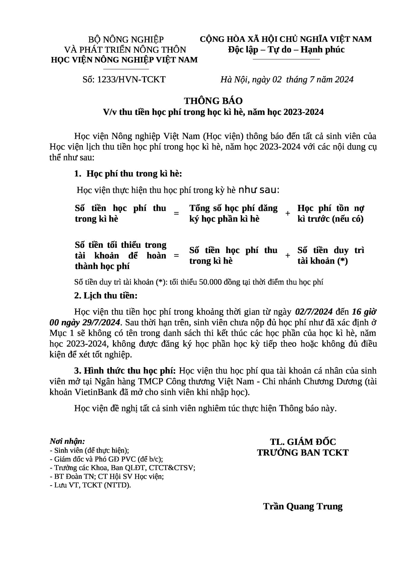 Thông báo, Tin sinh viên Thông báo V/v thu tiền học phí trong học kỳ hè, năm học 2023-2024 Ngày đăng: 06/07/202406/07/2024 by btvcodien Tin cùng thể loại Thông báo tuyển dụng Khảo sát tình hình việc làm của sinh viên tốt nghiệp năm 2024 Thông báo tổ chức Lễ bế giảng và trao bằng tốt nghiệp, bậc đào tạo Đại học, Hệ đào tạo chính quy đợt 3 năm 2025 Thông báo v/v mở lớp đặc biệt Học kỳ 1 năm học 2025-2026 Điều kiện để trở thành nghiên cứu sinh ngành Kỹ thuật cơ khí của khoa Cơ – Điện,Học viện Nông nghiệp Việt Nam
