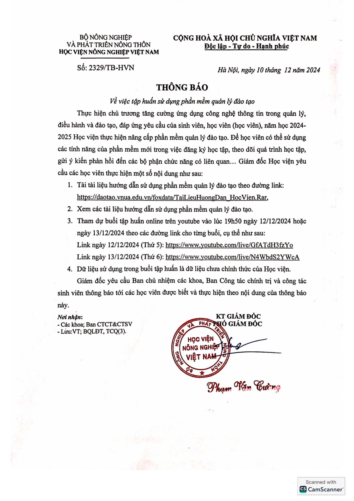 Đào tạo, Thông báo, Tin sinh viên Thông báo V/v tập huấn sử dụng phần mềm quản lý đào tạo Ngày đăng: 10/12/2024 by btvcodien Tài liệu hướng dẫn sử dụng phần mềm Link ngày 12/12/2024 Link ngày 13/12/2024 Tin cùng thể loại Thông báo tổ chức Lễ bế giảng và trao bằng tốt nghiệp, bậc đào tạo Đại học, Hệ đào tạo chính quy đợt 3 năm 2025 Thông báo v/v mở lớp đặc biệt Học kỳ 1 năm học 2025-2026 Điều kiện để trở thành nghiên cứu sinh ngành Kỹ thuật cơ khí của khoa Cơ – Điện,Học viện Nông nghiệp Việt Nam Học viện Nông nghiệp Việt Nam – Điểm đến của nghiên cứu sinh ngành Kỹ thuật cơ khí Khởi đầu rực rỡ của Tân sinh viên K70