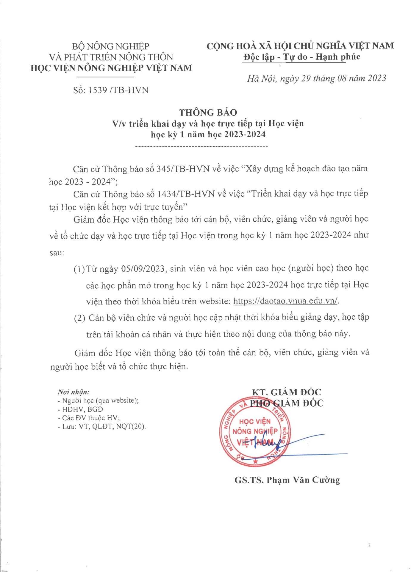 Thông báo, Tin sinh viên Thông báo về việc triển khai dạy và học trực tiếp tại Học viện học kỳ I năm học 2023-2024 Ngày đăng: 31/08/202331/08/2023 by btvcodien Tin cùng thể loại Thông báo tổ chức Lễ bế giảng và trao bằng tốt nghiệp, bậc đào tạo Đại học, Hệ đào tạo chính quy đợt 3 năm 2025 Thông báo v/v mở lớp đặc biệt Học kỳ 1 năm học 2025-2026 Điều kiện để trở thành nghiên cứu sinh ngành Kỹ thuật cơ khí của khoa Cơ – Điện,Học viện Nông nghiệp Việt Nam Khởi đầu rực rỡ của Tân sinh viên K70 Hướng dẫn thao tác cơ bản trên cổng thông tin đào tạo