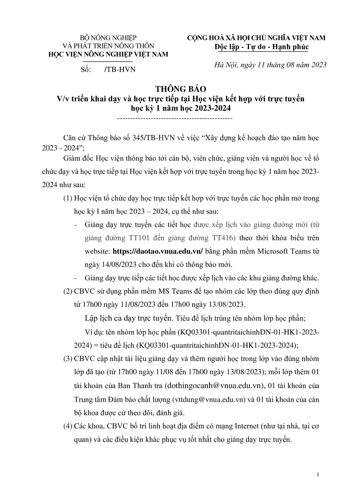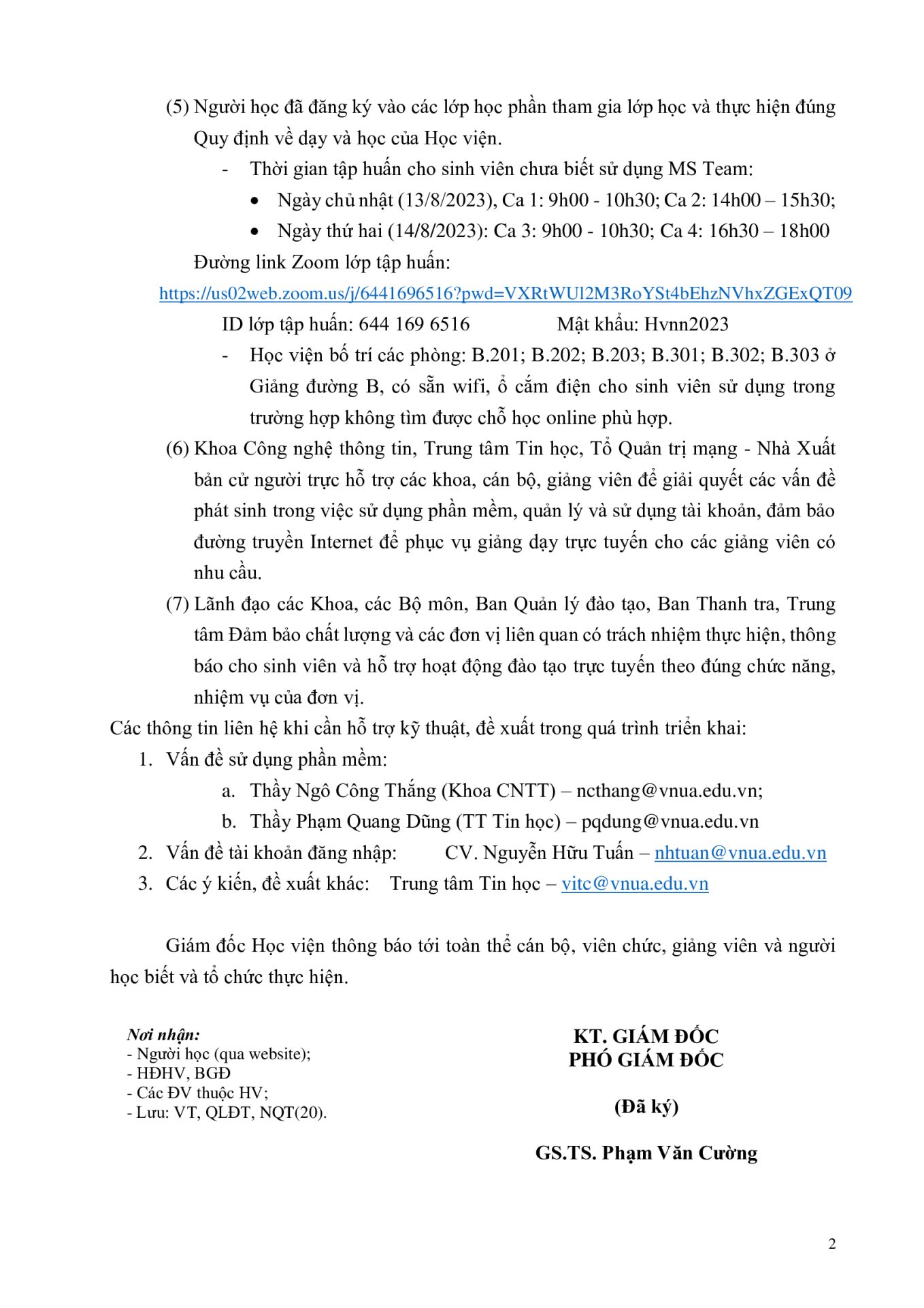 Thông báo, Tin sinh viên Thông báo về việc triển khai dạy và học trực tiếp tại Học viện kết hợp với trực tuyến học kỳ 1 năm học 2023-2024 Ngày đăng: 12/08/202312/08/2023 by btvcodien Đường link Zoom lớp tập huấn Tin cùng thể loại Thông báo tổ chức Lễ bế giảng và trao bằng tốt nghiệp, bậc đào tạo Đại học, Hệ đào tạo chính quy đợt 3 năm 2025 Thông báo v/v mở lớp đặc biệt Học kỳ 1 năm học 2025-2026 Điều kiện để trở thành nghiên cứu sinh ngành Kỹ thuật cơ khí của khoa Cơ – Điện,Học viện Nông nghiệp Việt Nam Khởi đầu rực rỡ của Tân sinh viên K70 Hướng dẫn thao tác cơ bản trên cổng thông tin đào tạo