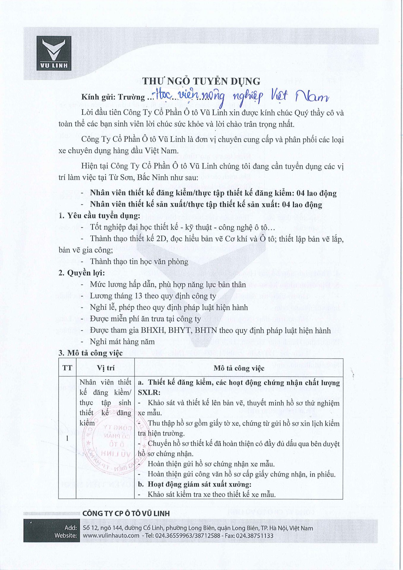 Thông báo Thông tin tuyển dụng của công ty Cổ phần ô tô Vũ Linh Ngày đăng: 22/04/202505/05/2025 by btvcodien Tin cùng thể loại Thông báo tổ chức Lễ bế giảng và trao bằng tốt nghiệp, bậc đào tạo Đại học, Hệ đào tạo chính quy đợt 3 năm 2025 Thông báo v/v mở lớp đặc biệt Học kỳ 1 năm học 2025-2026 Điều kiện để trở thành nghiên cứu sinh ngành Kỹ thuật cơ khí của khoa Cơ – Điện,Học viện Nông nghiệp Việt Nam Hướng dẫn thao tác cơ bản trên cổng thông tin đào tạo Thông báo V/v thu tiền học phí học kì I, năm học 2025-2026 đối với SINH VIÊN