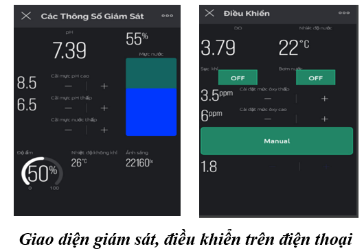Giao diện giám sát, điều khiển từ xa các thông số môi trường hệ thống aquaponics NFT trên điện thoại thông minh được thiết kế dựa trên ứng dụng Blynk với 2 phần: các thông số giám sát gồm pH, mực nước, độ ẩm, nhiệt độ không khí và ánh sáng; bảng điều khiển thị giá trị DO, nhiệt độ nước và các nút bật/tắt sục khí và bơm nước.