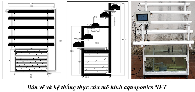 Mô hình hệ thống aquaponics nước cạn NFT được thiết kế gồm 01 bể nuôi cá kích thước 740x400x350mm, không gian phía trên bể cá được đặt 05 máng trồng cây dài 1100mm, mỗi máng khoét 06 lỗ để trồng cây. Trong hệ thống, công nghệ Internet vạn vật (Internet of Things – IoT) được ứng dụng để giám sát các thông số môi trường nước trong bể nuôi cá (nhiệt độ, độ pH, nồng độ oxy hòa tan) và môi trường không khí (nhiệt độ, độ ẩm, ánh sáng) xung quanh các máng trồng rau. Các thông số này được giám sát liên tục từ xa bằng điện thoại thông minh, đồng thời đưa ra cảnh báo khi các thông số vượt giá trị ngưỡng cài đặt. Các số liệu đo được có thể lưu trữ để phục vụ cho mục đích nghiên cứu.