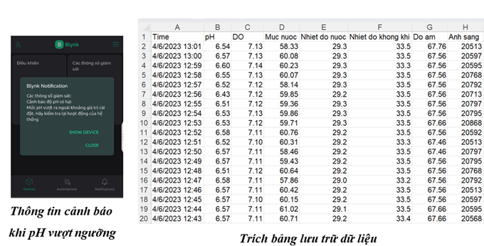 Kết quả chạy thử nghiệm cho thấy các thông số môi trường bể nuôi cá và môi trường không khí hiển thị trên các giao diện giám sát của hệ thống có sai số khá nhỏ so với kết quả đo bằng máy đo chuyên dụng (sai số của nồng độ DO dao động trong khoảng 1%, độ pH là 2%). So với các mô hình aquaponics truyền thống hiện có trên thị trường, mô hình aquaponics tự động ứng dụng công nghệ IoT có khả năng giám sát từ xa, tuy có xuất hiện sai số do tốc độ truyền dữ liệu nhưng không đáng kể, gửi thông tin cảnh báo khi các thông số giám sát nằm ngoài ngưỡng cài đặt, đồng thời có thể lưu trữ dữ liệu dưới dạng bảng excel thuận tiện cho người quản lý.