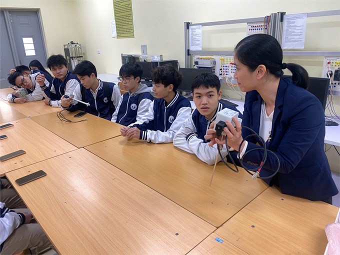 Đúng 13h45, tại khoa Cơ- Điện, đoàn giáo viên và học sinh trường THPT Nguyễn Văn Cừ do ThS. Lê Thị Quyên, Bí thư Chi bộ, Hiệu trưởng nhà trường và các giáo viên giảng dạy môn Vật lý tại lớp 11A3 và 11A7 là cô giáo Đỗ Thị Anh Trúc, Đỗ Thị Mai Lan đã được cán bộ, giảng viên và sinh viên Khoa Cơ – Điện đón tiếp nhiệt tình, chu đáo. TS. Nguyễn Chung Thông – Phó trưởng khoa Cơ – Điện trực tiếp giới thiệu với đoàn về khoa và các ngành đào tạo. TS Nguyễn Thái Học giới thiệu về mạch cảm biến và ứng dụng. Dưới sự hướng dẫn của các giảng viên, sinh viên khoa Cơ – Điện, các em học sinh được chia thành 5 nhóm nhỏ, trực tiếp quan sát và tìm hiểu về nguyên lý hoạt động của các loại máy móc, thiết bị hiện đại như máy robot công nghiệp, hệ thống điều khiển tự động,… Không chỉ vậy, các em còn được tự tay thực hiện một số thí nghiệm nhỏ, lắp ráp các mô hình đơn giản để hiểu rõ hơn về các định luật vật lý.