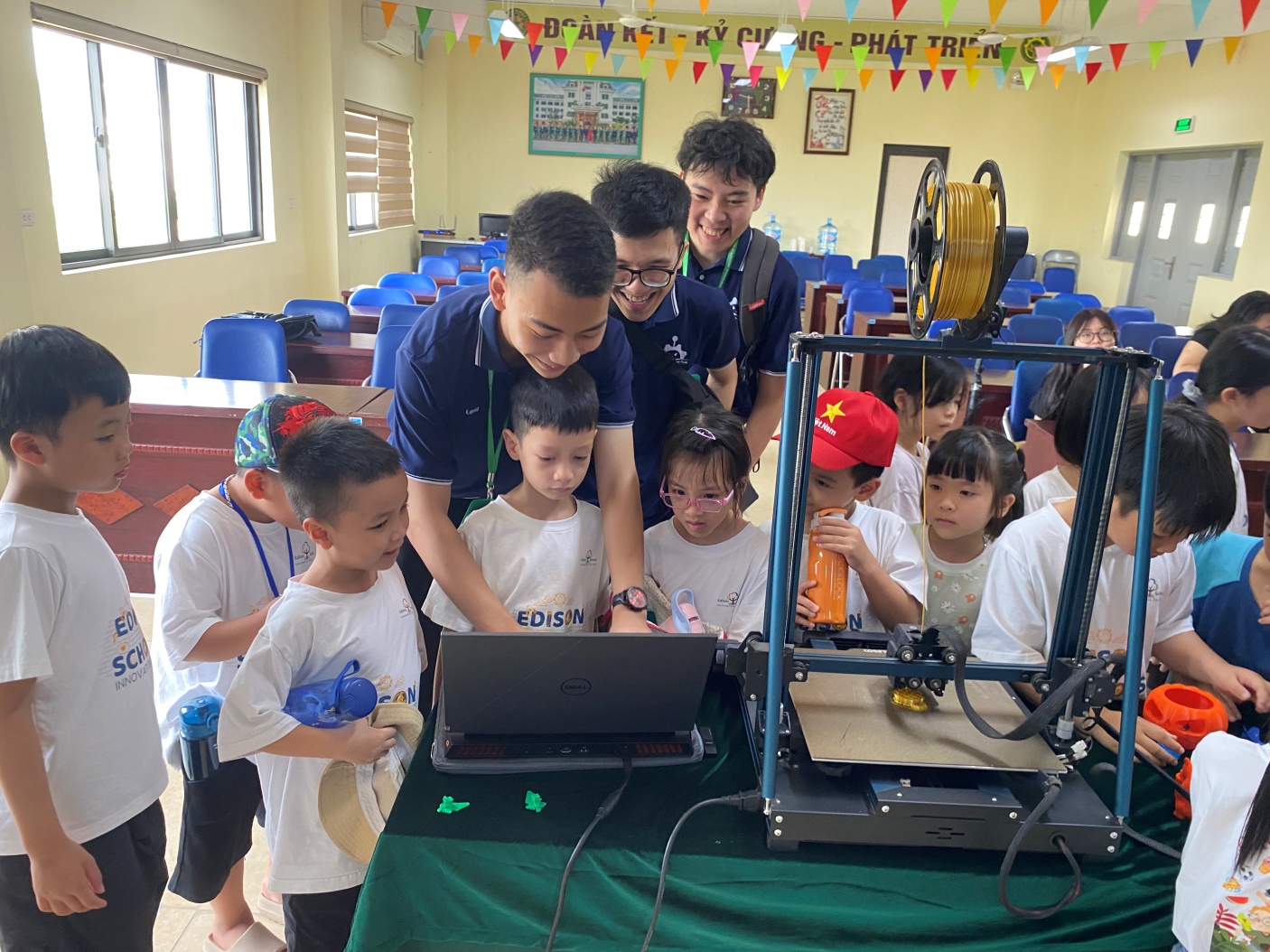 - Khu 1 – Máy in 3D: Tại đây, các em được làm quen với công nghệ in 3D hiện đại, quan sát quá trình tạo ra các mô hình ba chiều là các đồ vật và con thú ngộ nghĩnh, đáng yêu. Những sản phẩm thực tế sinh động đã thu hút sự chú ý và khiến các em vô cùng thích thú.