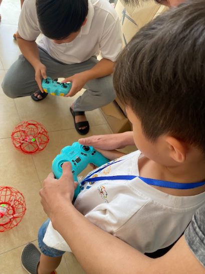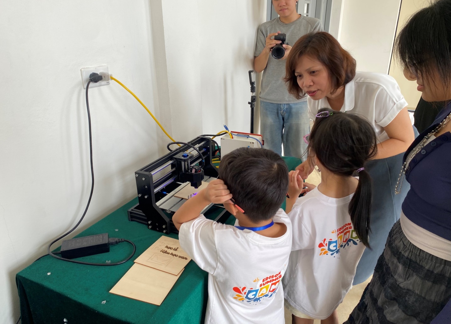 - Khu 2 – Máy khắc laser và drone football: Các em được quan sát các máy khắc laser hoạt động để tạo hình các con vật, họa tiết ngộ nghĩnh một cách trực quan. Ở một góc của không gian này, các em cũng được tham gia trải nghiệm trực tiếp điều khiển drone football – một loại máy bay không người lái được thiết kế để thi đấu thể thao, đem lại cảm giác mới lạ và đầy hào hứng.