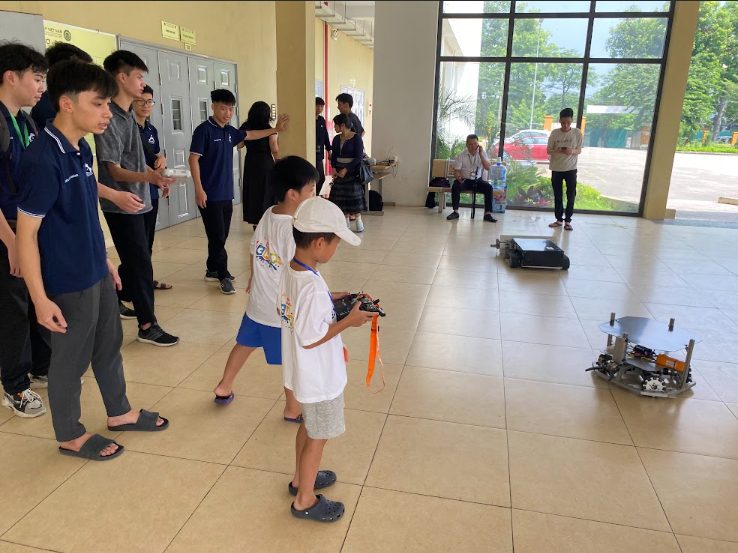 - Khu 3 – Robot di động: Ở khu vực này, học sinh được trải nghiệm điều khiển các mô hình robot di động. Sau vài phút làm quen, nhiều em đã nhanh chóng thao tác thành thạo và rất phấn khởi khi robot thực hiện di chuyển theo các lệnh điều khiển.