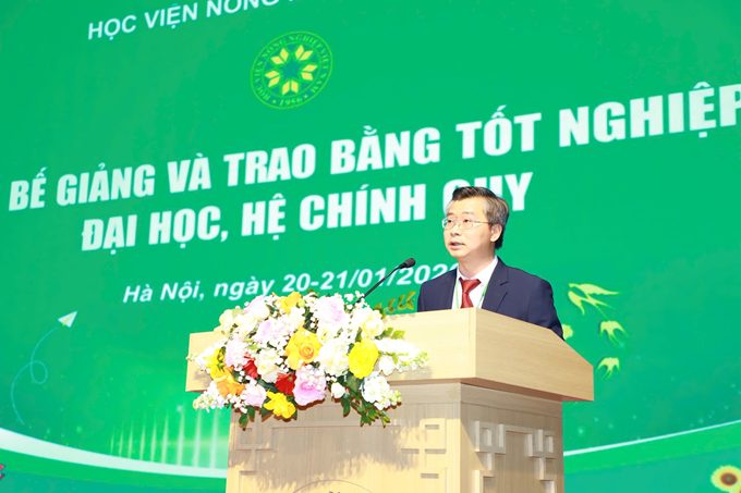 Phát biểu tại buổi lễ, PGS.TS. Nguyễn Công Tiệp – Ủy viên Ban Thường vụ Đảng ủy, Phó Giám đốc Học viện đã gửi tới các tân kỹ sư/tân cử nhân/tân bác sĩ thú y lời chúc mừng nồng nhiệt nhất. Thầy khẳng định: Tấm bằng hôm nay không chỉ là minh chứng cho năng lực, mà còn là biểu tượng của ý chí và nghị lực – của một thế hệ sẵn sàng gánh vác tương lai của dân tộc chúng ta. Thầy mong rằng, dù ở bất cứ đâu, làm bất kỳ công việc gì, các em vẫn luôn mang trong mình những nét văn hóa riêng có của sinh viên Học viện Nông nghiệp Việt Nam với một trái tim ấm áp, một tinh thần học hỏi không ngừng, một tâm hồn trong sáng và luôn có khát vọng cống hiến, dấn thân vì tương lai của dân tộc. Hãy xứng đáng là con cháu của Bà Triệu với khát vọng non sông: “Tôi muốn cưỡi cơn gió mạnh, đạp luồng sóng dữ, chém cá kình ở Biển Đông…”.