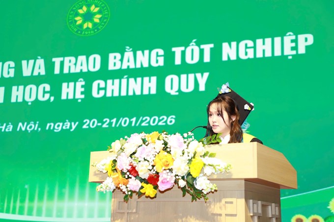 Thay mặt cho 938 sinh viên nhận bằng tốt nghiệp đợt này, em Cao Hải Yến – tân cử nhân nhận bằng tốt nghiệp loại xuất sắc ngành Kế toán đã bày tỏ lòng biết ơn sâu sắc tới Đảng ủy, Ban Giám đốc Học viện, các thầy giáo, cô giáo và cán bộ, viên chức đã tận tâm dìu dắt các em trong suốt những năm tháng học tập tại Học viện Nông nghiệp Việt Nam. Hải Yến khẳng định: Hành trình học tập bậc đại học không chỉ là quá trình tích lũy tri thức chuyên môn, mà còn là quãng thời gian trưởng thành về nhân cách, bản lĩnh và khát vọng cống hiến. Dưới mái trường Học viện, các em đã được học tập trong môi trường hiện đại, năng động, chuyên nghiệp, được tham gia nghiên cứu khoa học và các hoạt động cộng đồng – những hành trang quý báu để chúng em tự tin bước vào đời. Hải Yến bày tỏ quyết tâm sẽ tiếp tục học tập, rèn luyện, không ngừng đổi mới, giữ vững đạo đức nghề nghiệp và phát huy truyền thống của sinh viên Học viện, góp phần xây dựng đất nước và địa phương, xứng đáng với niềm tin yêu của Học viện, thầy, cô và xã hội.