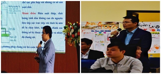 Ở phần tiếp theo của chương trình Hội thảo, các cán bộ giảng viên, các thành viên nhóm nghiên cứu cùng theo dõi và thảo luận kết quả nghiên cứu của các báo cáo khoa học. Báo cáo đầu tiên: “Nghiên cứu, xây dựng hệ thống điều khiển và giám sát tự động các thông số của mô hình chiết xuất tinh dầu qua Internet” do TS. Nguyễn Thái Học trình bày. Các phương pháp chiết xuất tinh dầu hiện nay đơn giản, dễ thực hiện ở quy mô lớn hoặc gia đình. Tuy nhiên, chúng đều cho hiệu suất thấp, chất lượng tinh dầu không cao hoặc sử dụng dung môi độc hại dẫn đến hiệu quả kinh tế thấp và có khả năng gây độc hại đến người sử dụng. TS. Nguyễn Thái Học đã xây dựng, thiết kế mô hình chiết xuất theo phương pháp lôi cuốn hơi nước. Mô hình thiết kế này có khả năng kiểm soát, phát hiện, cảnh báo, xử lý và điều tiết tự động một số thông số của quy trình như nhiệt độ, nước trong lò hơi, làm mát, ngưng tụ tinh dầu với độ chính xác lên tới 98%. Nhờ vậy, hiệu suất, sản lượng và chất lượng tinh dầu đã được nâng cao so với các phương pháp truyền thống trước đây. Đây là chủ đề nhận được nhiều sự trao đổi về phương pháp thực hiện, cách thức chọn các thông số đầu vào, những thay đổi của mô hình khi đưa vào sản xuất với số lượng lớn, …