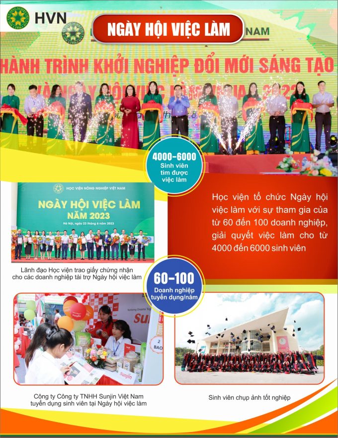 Hàng năm, Học viện tổ chức Ngày hội việc làm với sự tham gia của từ 60 đến 100 doanh nghiệp, giải quyết việc làm cho từ 4.000 đến 6.000 sinh viên. Năm 2022, Học viện vinh dự đón tiếp Thủ tướng Chính phủ Phạm Minh Chính về dự Chương trình Hành trình khởi nghiệp đổi mới sáng tạo và Ngày hội việc làm VNUA.